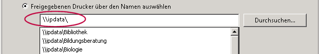 Wenn sich der gewünschte Drucker nicht in der Liste befindet, klickt man auf "Der gesuchte Drucker ist nicht aufgeführt", tippt so den Namen des Druckservers ein: \\ipdata\ und wählt aus der daraufhin aufgehenden Liste den Drucker aus.