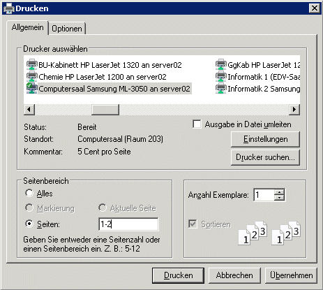 Wenn man sich den Drucker aussuchen will, muß man - anstatt auf das Druckersymbol - in der Menüzeile auf Datei und dann auf Drucken klicken. Im Fenster "Drucken" kann man dann in der Liste der an der Station registrierten Drucker den gewünschten einstellen.