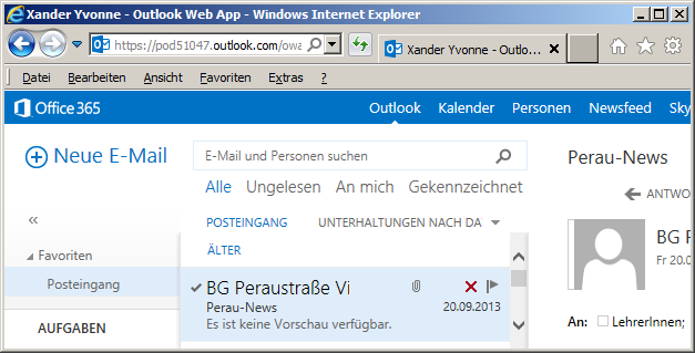 Das Mailkonto wird am einfachsten mit einem Browser auf mail.peraugym.at genutzt. Hier meldet man sich auf der Seite "Outlook 365" mit der Mailadresse an. [Nach einem Klick auf "Outlook" wird "Outlook Web App" geladen und] Es erscheint dieses Webmail-Fenster: |