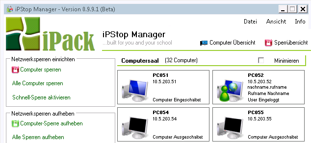 In den Computerräumen kann der Internetzugang an den Schülerstationen vom Lehrer von der Lehrerstation aus gesteuert werden. Das Programm für die Internetsperre wird in der am Desktop befindlichen Management-Console (iPack-MMC) angeboten und beim ersten Aufruf installiert.