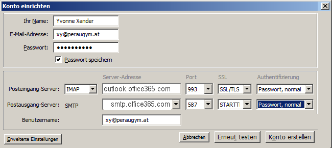 | Thunderbird aufrufen; im Fenster "Konto einrichten" die Zeilen für Name, E-Mail-Adresse und Kennwort ausfüllen, Klick auf "Weiter" und "Manuell bearbeiten". Posteingang-Server: IMAP, outlook.office365.com, 993, SSL/TLS, Passwort normal. Postausgang-Server: smtp.office365.com, 587, STARTTLS, Passwort normal. Benutzername: xy@peraugym.at ( xy = eigenes Kurzzeichen). Konto erstellen. |