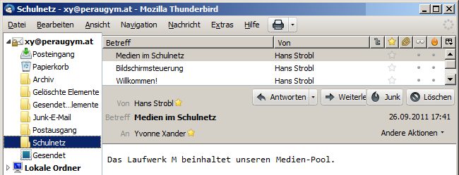 | Thunderbird ist ein freies Mailprogramm, das PC-gebunden nutzbar ist und an allen Stationen vorinstalliert ist. Um es verwenden zu können, müssen einige Angaben zur Mailbox eingetragen werden. (Achtung: Diese Einstellungen müssen nach einer Neuinstallation des PC erneut vorgenommen werden.) | |
