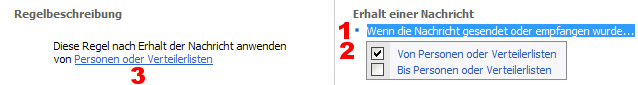 1: Wenn die Nachricht gesendet oder empfangen wurde, 2: Von Personen oder Verteilerlisten, 3: Personen oder Verteilerlisten