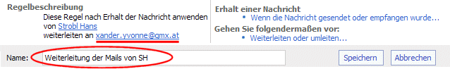 Name (eintragen, z.B.): Weiterleiten der Mails von SH, Speichern.