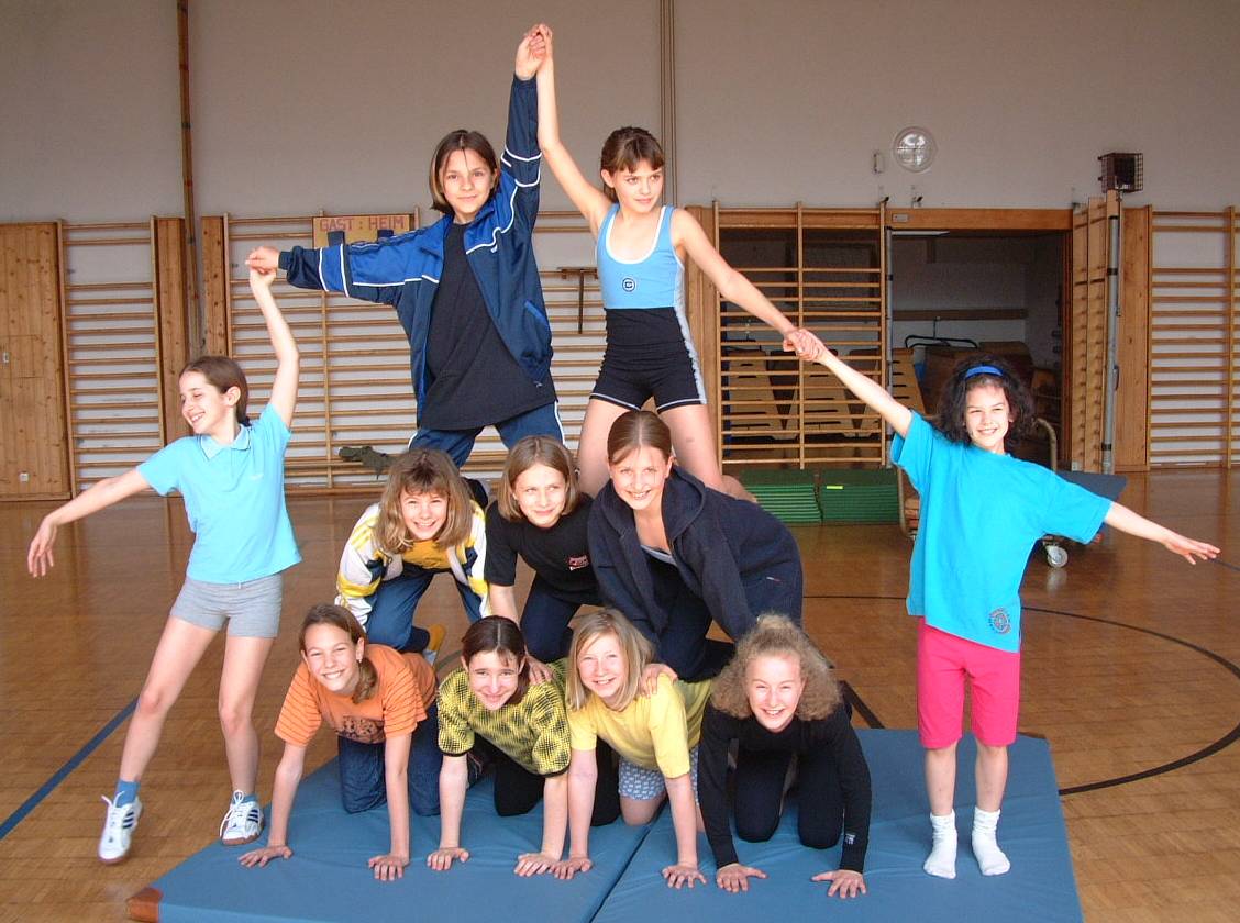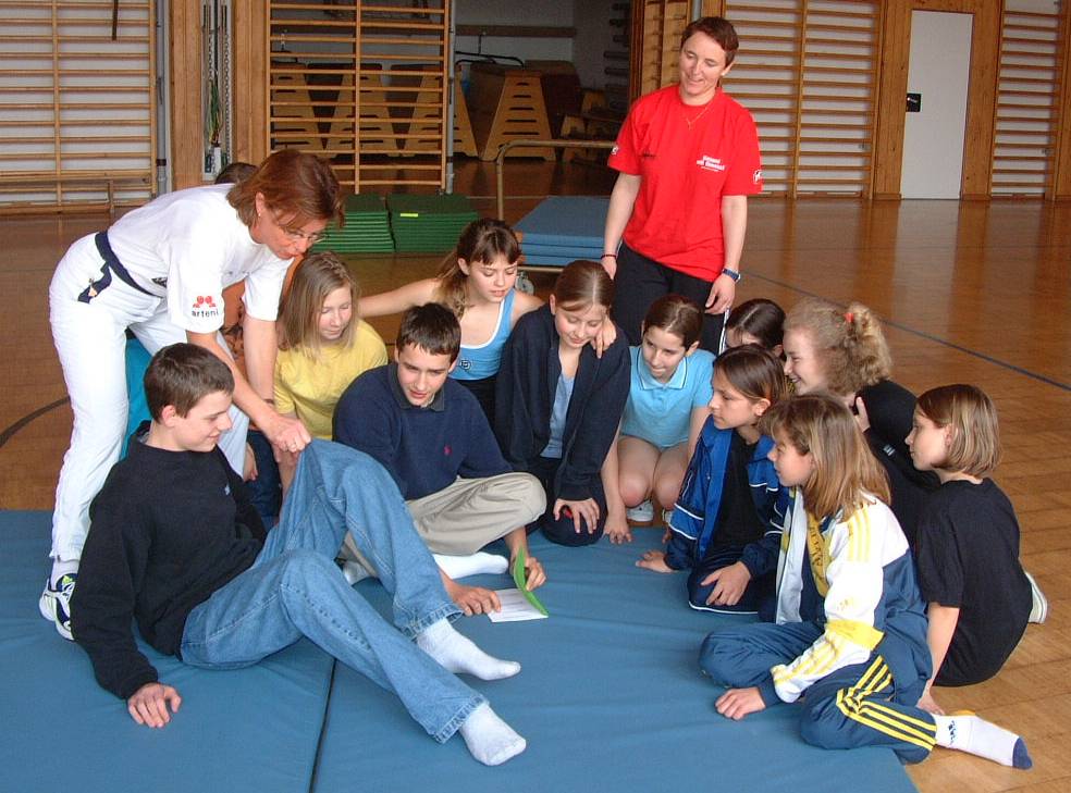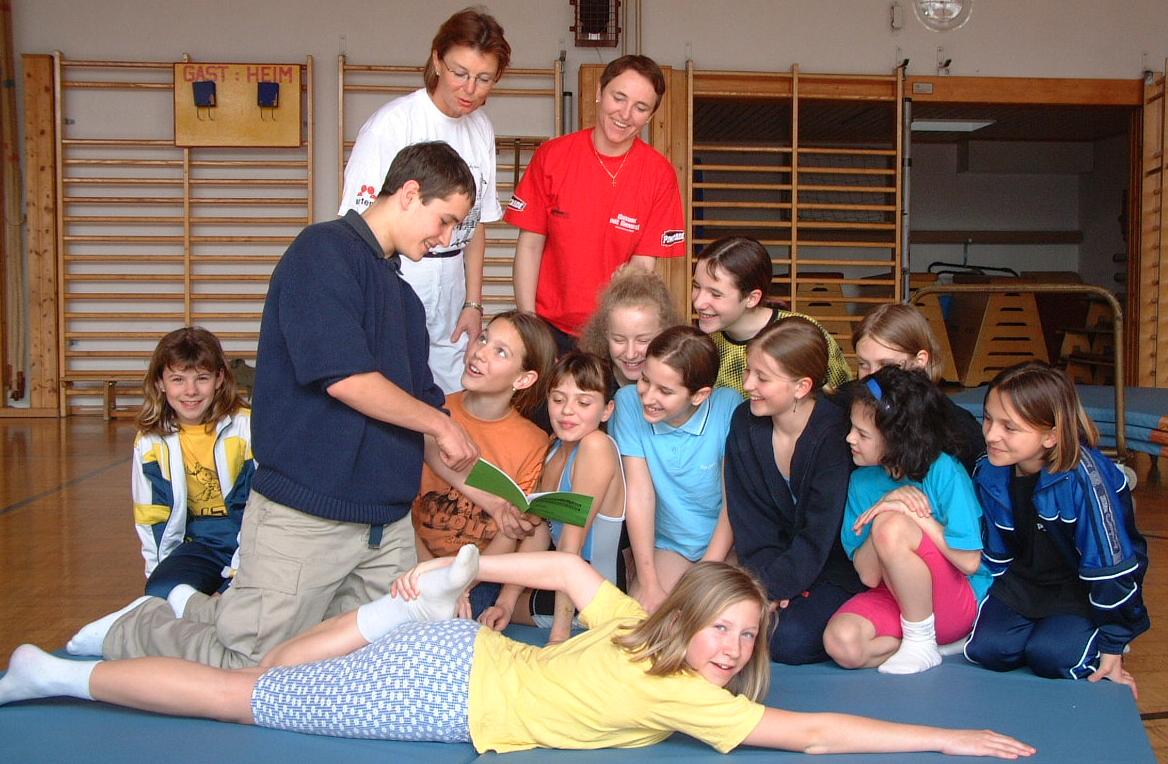 der 6.Klassen testen mit Muskelfunktionstests Schülerinnen der 1B-Klasse und geben gezielte Aufbauübungen eines Fitnessprogramms vor.